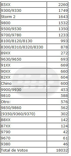 Nota: Los modelos como el Torch 9810, 9850, 9860 y BlackBerry Bold Touch 99xx (9900, 9930) aparecieron en los ultimos meses del 2011. esto permite que estos modelos tengan menos votos.