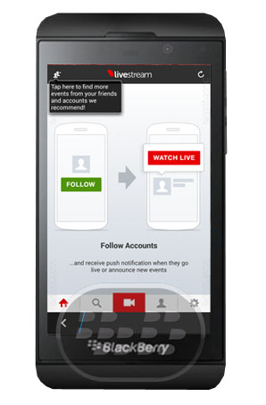 Livestream es el lugar de estreno para ver eventos en vivo y transmitido en vivo desde su teléfono BlackBerry 10. Sigue a tus amigos y celebridades favoritos, equipos, músicos, marcas, organizaciones, eventos y más para ser notificado cuando están en vivo. Encontrar nuevos eventos en vivo y futuros de las cuentas que sigues diariamente.