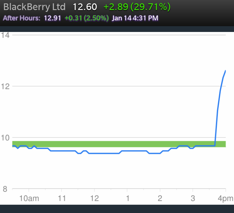 Reuters también informa que Samsung propone un rango de precio de $ 13,35 a $ 15,49 por acción. Las acciones de BBRY abrieron la jornada en 9,32 dólares y se negociaban por debajo de $ 10 antes de la noticia, pero desde entonces se han disparado a más de $ 12 la acción después de este rumor.